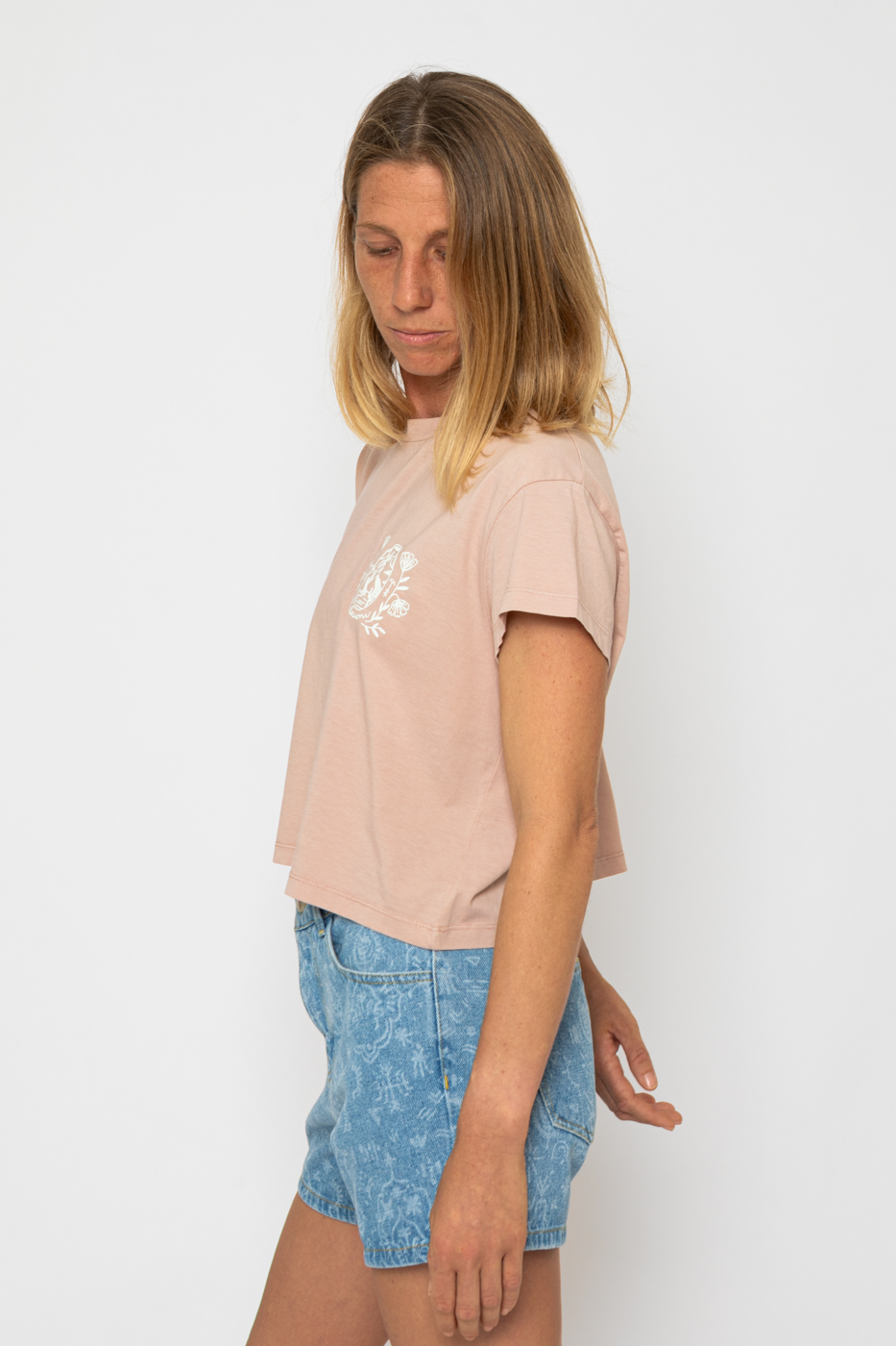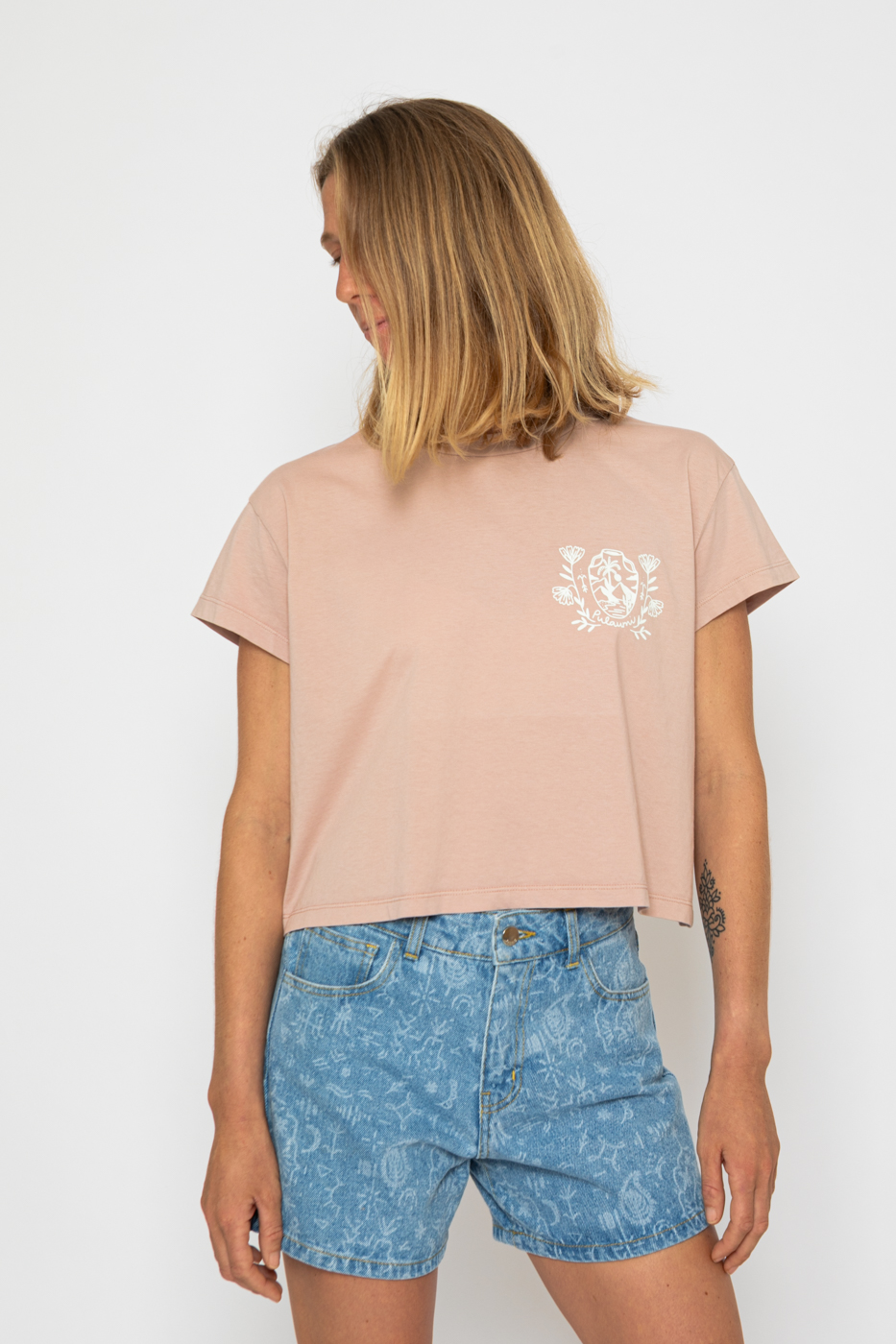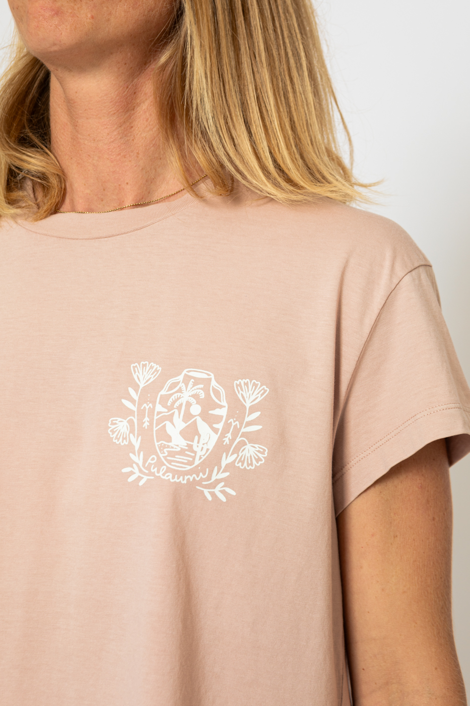 This cropped tee is made for easy, everyday wear with a touch of island style. It’s made from 100% cotton and finished with a vintage wash for a soft, faded look. The front features a simple chest print with an island landscape and pot design – a simple, creative nod to nature and escape.
